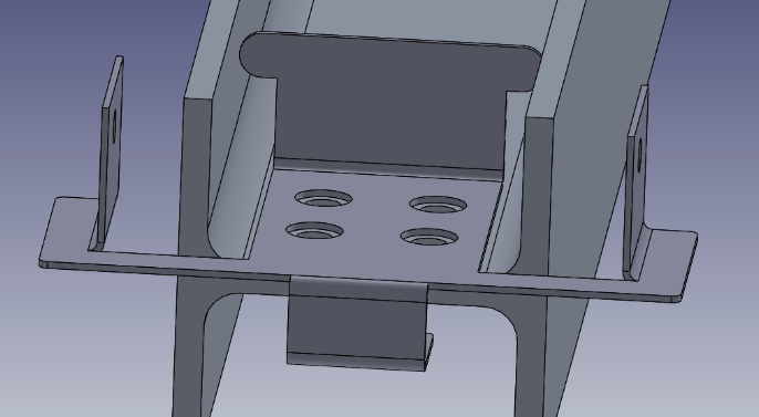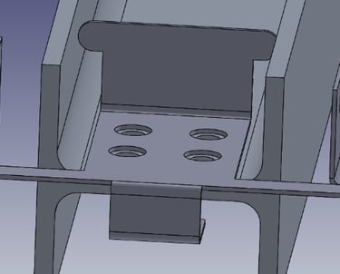 Design 3: Sheet metal bent and stamped to shape, with drill bushings to help with perpendicular drilling. PEM inserts pressed into the bottom and side holes, to allow for fasteners to clamp the jig in place. Circular flange locating features help orient the jig to the desired location.