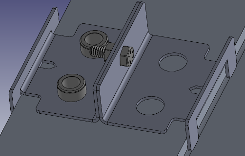 Design 2: Two pieces of sheet metal, bent and stamped to form final shape. Parts are clamped together at the center with a fastener, along with drill bushings pressed into the holes.