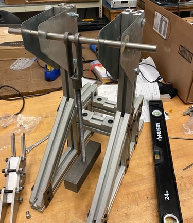 Designed and prototyped in SolidWorks, this stand was constructed entirely with spare parts to minimize cost and lead time. Several components were manually machined, with brackets waterjet-cut, holes tapped on a mill and extrusions cut to size with a bandsaw. DFMA was implemented through standardizing the hole sizes to reduce tooling, and by eliminating unnecessary supports to reduce total part count.
